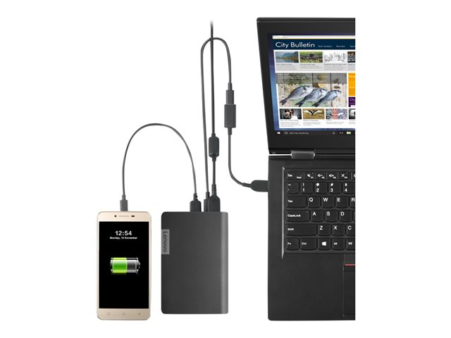 Munissez-vous de batteries en plus pendant vos déplacements ! La batterie externe pour ordinateur portable Lenovo USB-C est compatible avec les ordinateurs portables Lenovo et ThinkPad à ports USB-C et prises fines, et fournit une durée de vie de la batterie de 48 Wh (14 000 mAh) afin de prolonger l'autonomie de votre appareil portable et de booster votre productivité. Grâce à ses deux ports USB-A intégrés supplémentaires, la batterie externe pour ordinateurs portables Lenovo USB-C permet de charger les périphériques mobiles petit format. Cette batterie est très portable et permet également la charge simultanée, par conséquent vous pouvez charger votre appareil portable et votre batterie externe en même temps tout en travaillant sur votre station de travail.