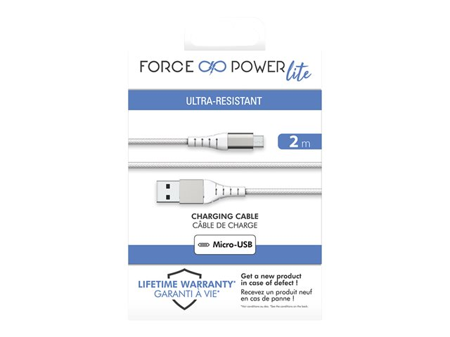 Description du produit Force Power - câble USB - USB pour Micro-USB de type B - 2 m Type Câble USB Fonctions Synchronisation et charge, tressé Longueur 2 m Connecteur USB de type A 4 broches - mâle Connecteur (deuxième extrémité) Micro-USB de type B de 5 broches - mâle Courant nominal 2.1 A Couleur Blanc Garantie du fabricant Garantie limitée à vie -