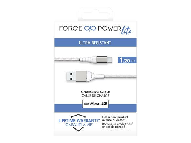 Description du produit Force Power - câble USB - USB pour Micro-USB de type B - 1.2 m Type Câble USB Fonctions Synchronisation et charge, tressé Longueur 1.2 m Connecteur USB de type A 4 broches - mâle Connecteur (deuxième extrémité) Micro-USB de type B de 5 broches - mâle Courant nominal 2.1 A Couleur Blanc Garantie du fabricant Garantie limitée à vie -